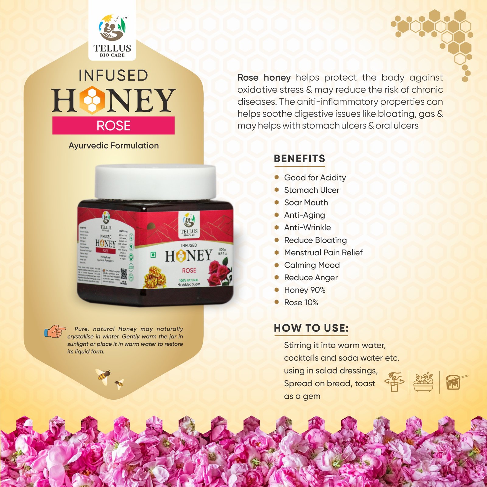 *Price Inclusive of All TaxesRose honey helps protect the body against oxidative stress & may reduce the risk of chronic diseases. The aniti-inflammatory properties can helps soothe digestive issues like bloating, gas & may helps with stomach ulcers & oral ulcers