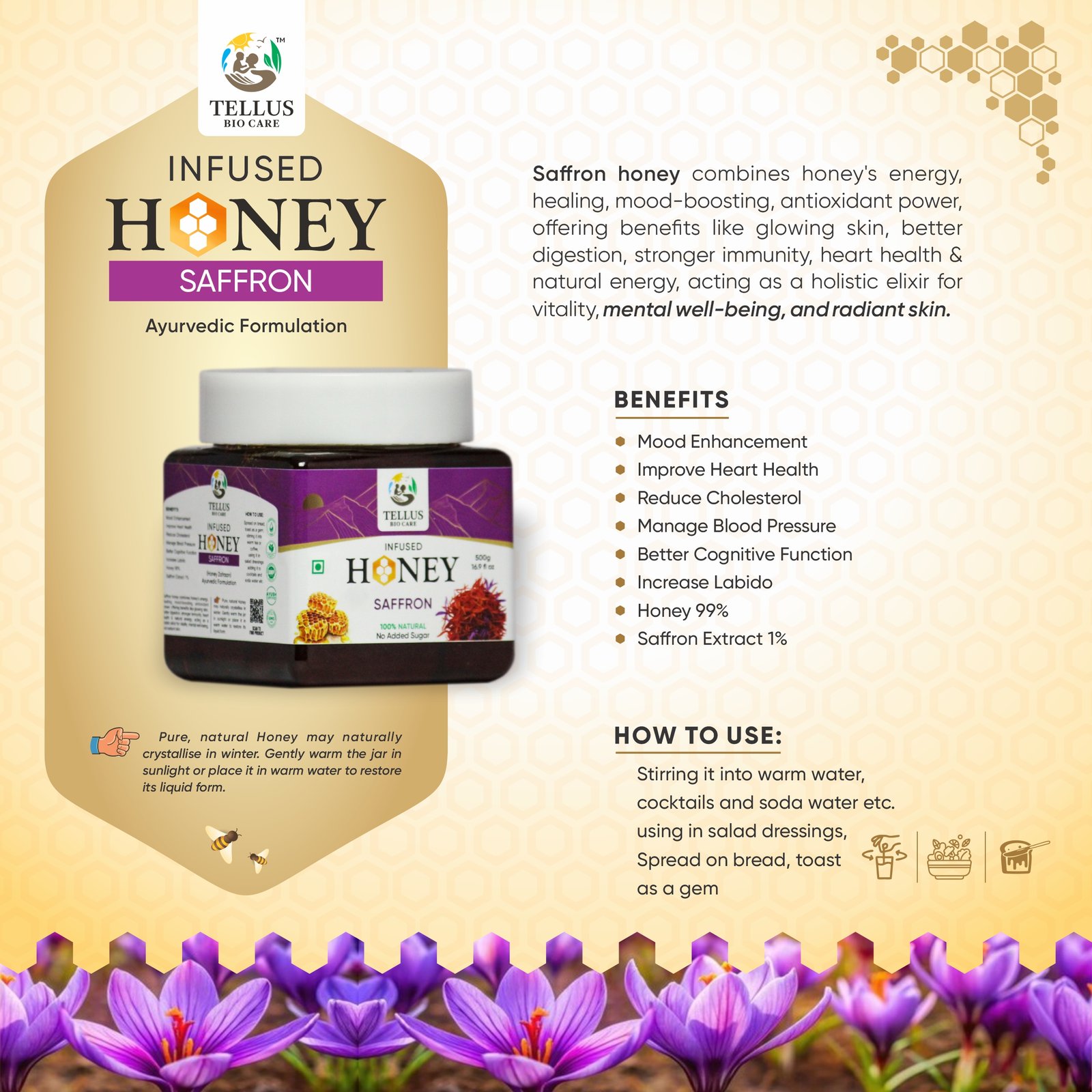 Saffron honey combines honey’s energy, healing, mood-boosting, antioxidant power, offering benefits like glowing skin, better digestion, stronger immunity, heart health & natural energy, acting as a holistic elixir for vitality, mental well- being, and radiant skin.